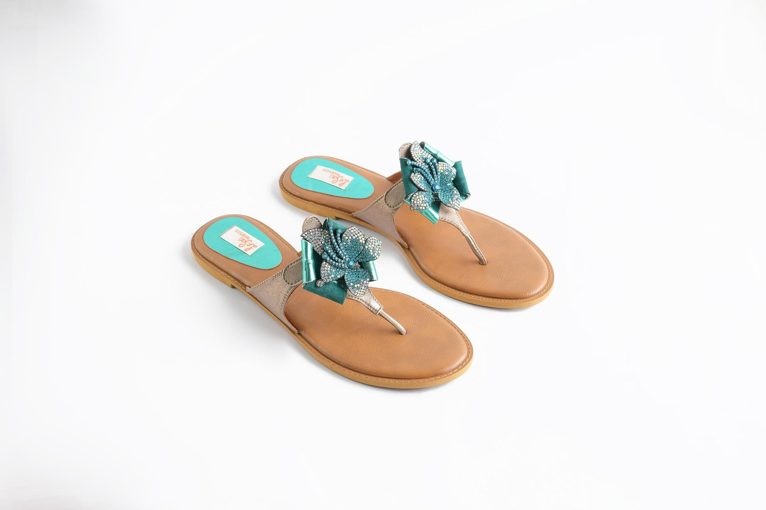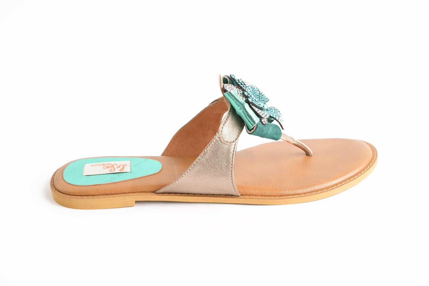 These genuine leather sandals feature a beautiful diamante-studded flower on the strap, adding a touch of sparkle and elegance to your everyday look.