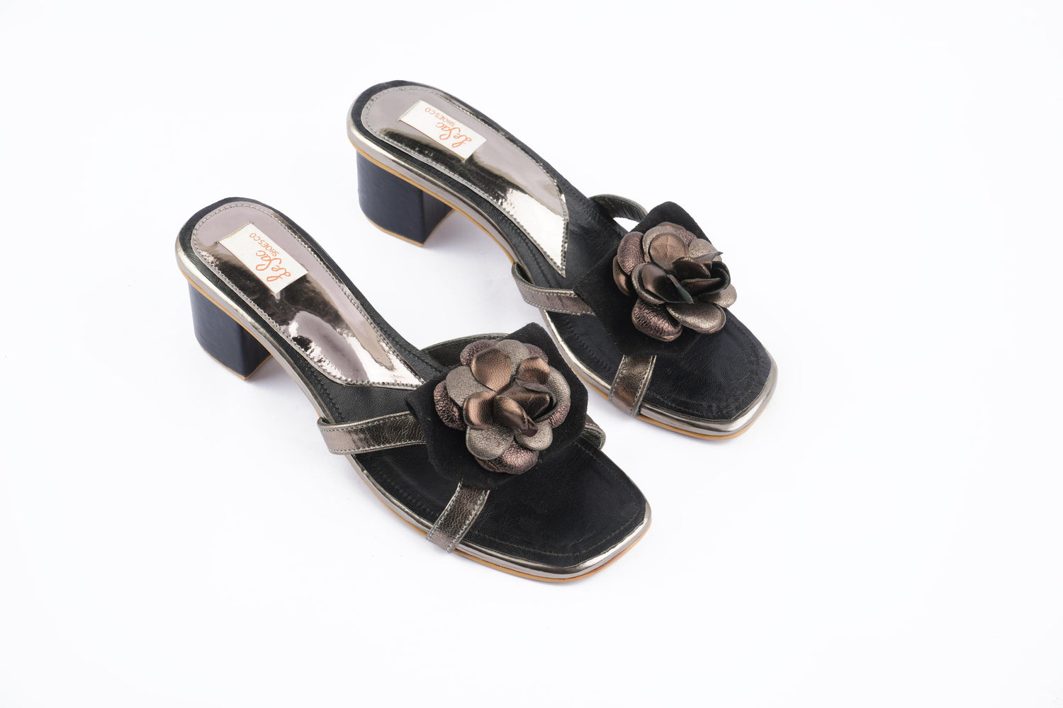 Heeled Leather Sandals with Handcrafted Floral Accent