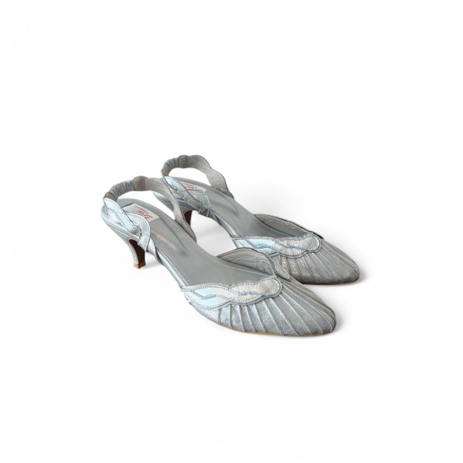 Inspired by celestial beauty, the Celestial Blue Slingback Heels showcase an intricate winged embroidery design on a shimmering blue base. The delicate slingback strap ensures a secure fit, making these heels a dreamy choice for evening galas, festive occasions, and elegant gatherings.