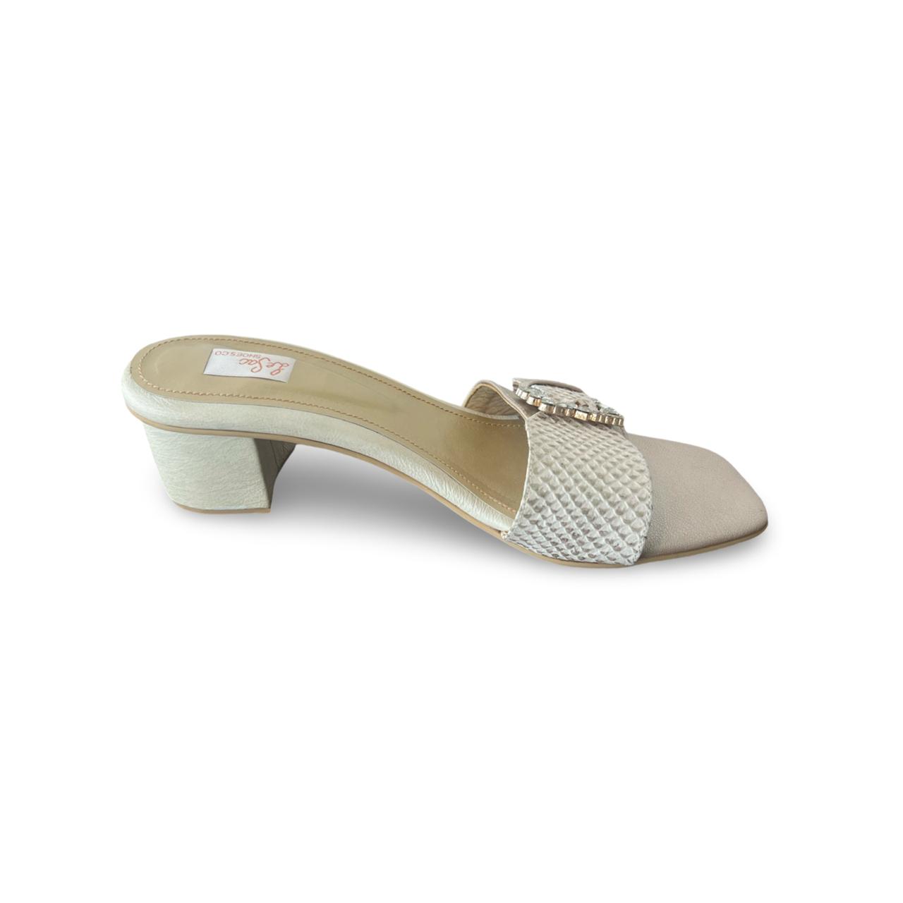These block heel mules showcase a luxurious woven-texture strap adorned with sparkling gemstones. The square toe design combined with the metallic sheen creates a perfect blend of glamour and practicality, ideal for both casual outings and semi formal events.